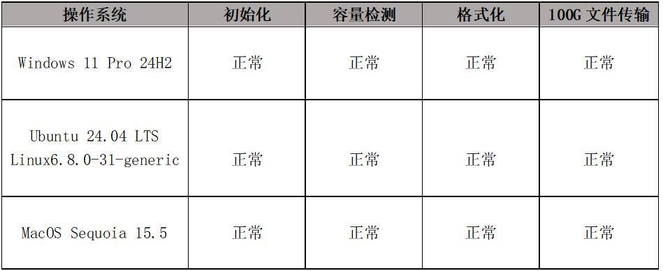作为一款集成U.2接口的硬盘抽取盒,MB741V4P-B理论上具有广泛的兼容性能。本次测试在两类系统下进行硬盘的设置,验证在不同系统中是否可以正常运行。同时,运用Fast copy v4.1.1对硬盘进行100G文件传输测试。实验过程中,硬盘的的设置以及读写性能没有出现任何的兼容问题,完美适配以下两类操作系统。