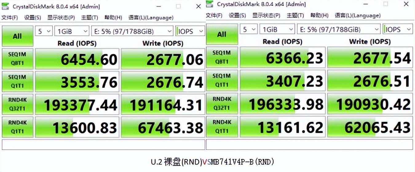总体来看,上述数值差异较小,速度没有出现明显的波动变化。对比裸盘,搭载MB741V4P-B后,读写差异控制在裸盘速度的2%以内。其中顺序读取和随机写入两项数值呈现反超趋势,这得益于MB741V4P-B的原生U.2接口,有效降低硬盘的数据传输折损率,加强了数据传输稳定性。