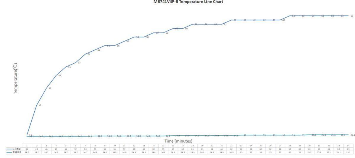 总体来看,在高负载情况下,U.2硬盘温度由35℃上升到63℃,相差值为28℃,平均每分钟约上升0.8℃,期间硬盘运行平稳,散热表现优秀。环境温度随着硬盘温度上升有所变化,但总体变化较小,总上升0.4摄氏度, 没有出现热量囤积情况。