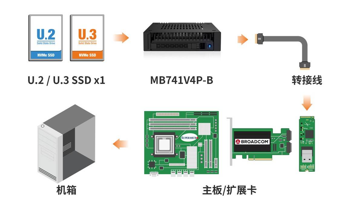 需要注意的是,使用MB741V4P-B需搭配Slim SAS或OCuLink转U.2数据线。但用户无需过度担心兼容性问题,经测试,该产品可兼容市面上多数主流主板自带的NVMe接口、RAID/HBA卡及M.2转接卡,且不占用PCIe插槽,为用户保留了更多硬件扩展空间。