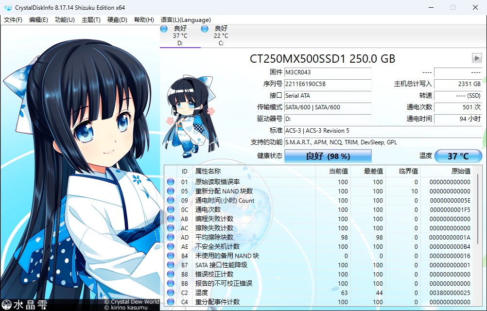 SATA硬盘选择的是镁光MX500 250GB,在Windows系统内通过CrystalDiskInfo识别到相关信息,传输模式支持SATA/600(6G/S),也就是我们常说的SATA 3.0。