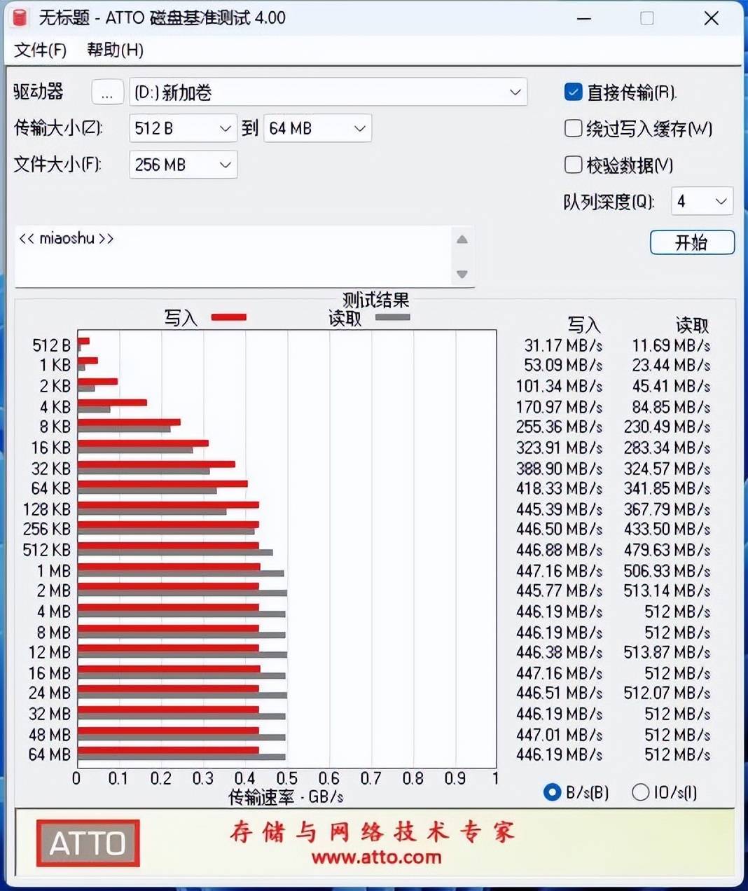 ATTO基准测试,传输大小从512B-64MB,文件大小选择256MB,写入平均达到446.3MB/s,读取平均达到512.0MB/s。