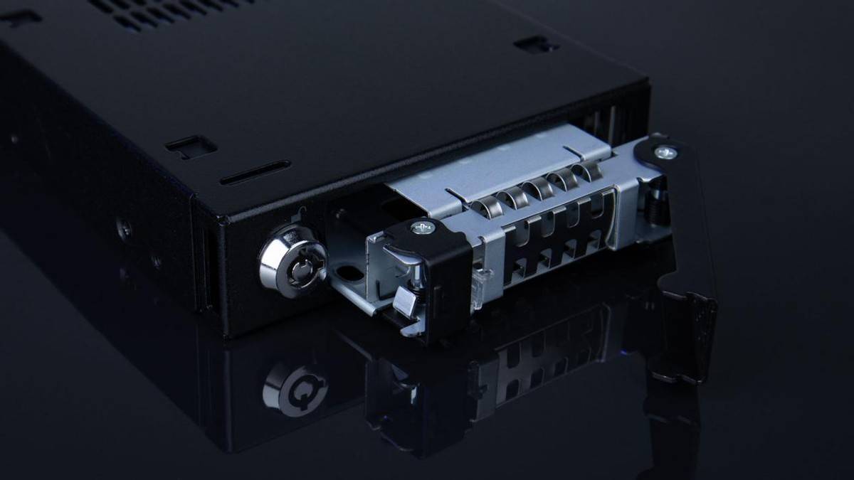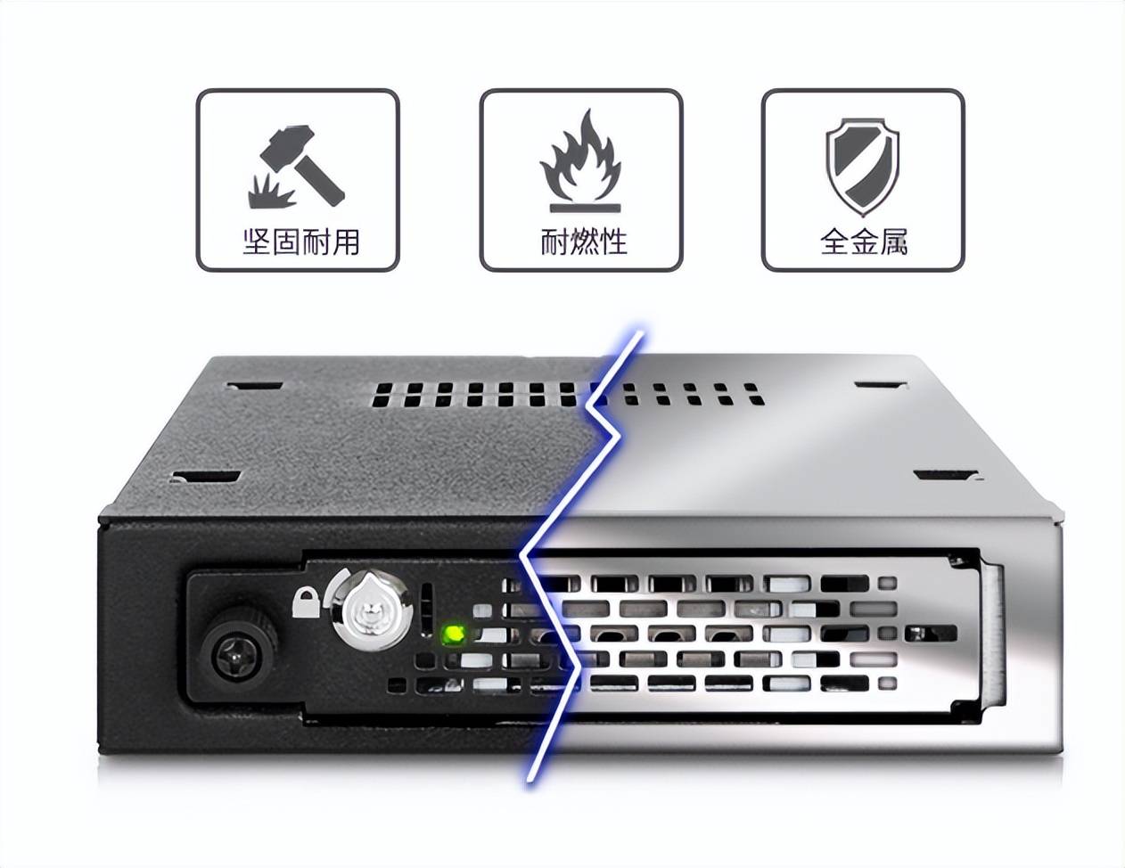 这款MB991SK-B硬盘盒采用全金属结构设计,正面带有一个安全锁扣,这正是ICY DOCK独有的双锁设计,另一安全锁扣采用鹰钩索设计,若硬盘发生故障,维修上亦不用烦恼,只需轻松地抽出硬盘即可替换,尤其时间紧迫的时候更是大大减少了维修时间。