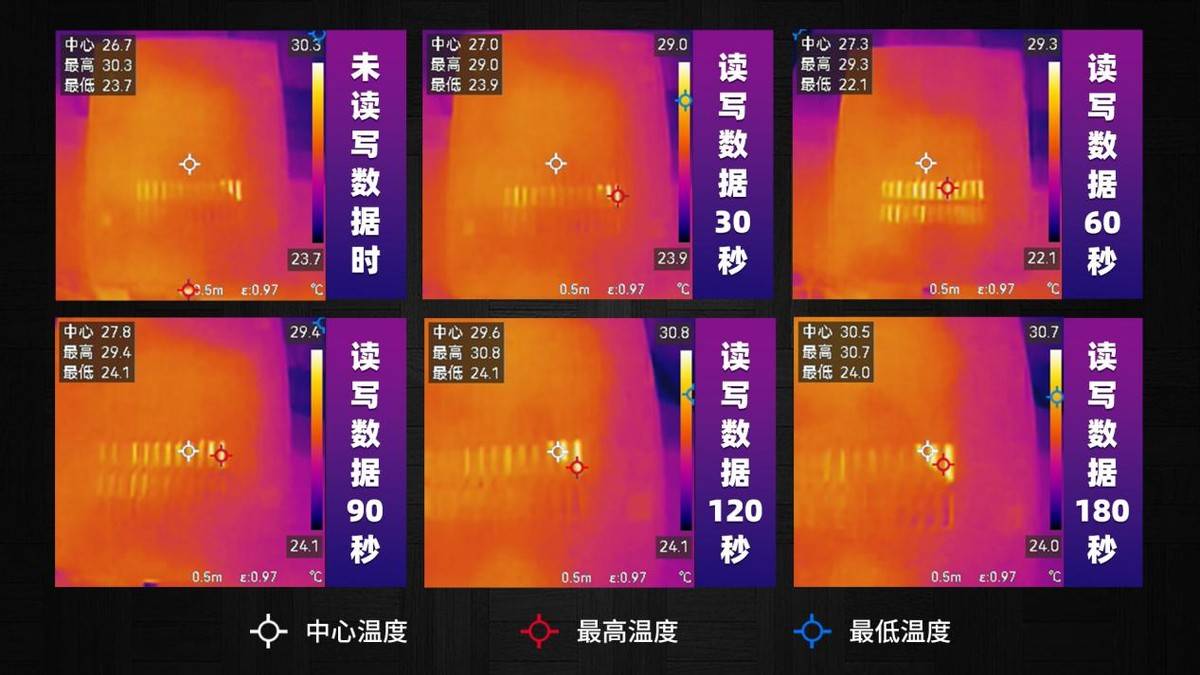 在室温26.5°C(机箱无散热风扇,机箱侧板打开状态),通过手持测温热像仪检测温度,通过MB991SK-B连接测试,硬盘在待机时,温度为26.7°C,随后每30秒进行一次温度监控,具体数据如上图所示,测试超过180秒后,温度维持在30.5°C,随后温度一直保持在30°C-32°C,属于正常温度水平(正常温度为50°C以内)。