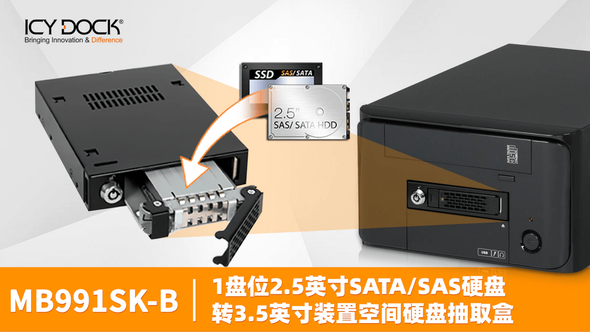 通过ICY DOCK MB991SK-B将1块SATA/SAS硬盘安装在机箱3.5英寸空间位置,在机箱没有3.5英寸装置位时,也可以通过在机箱5.25英寸光驱位先安装ICYDOCK的MB343SP转接支架,然后再安装MB991SK-B硬盘盒。