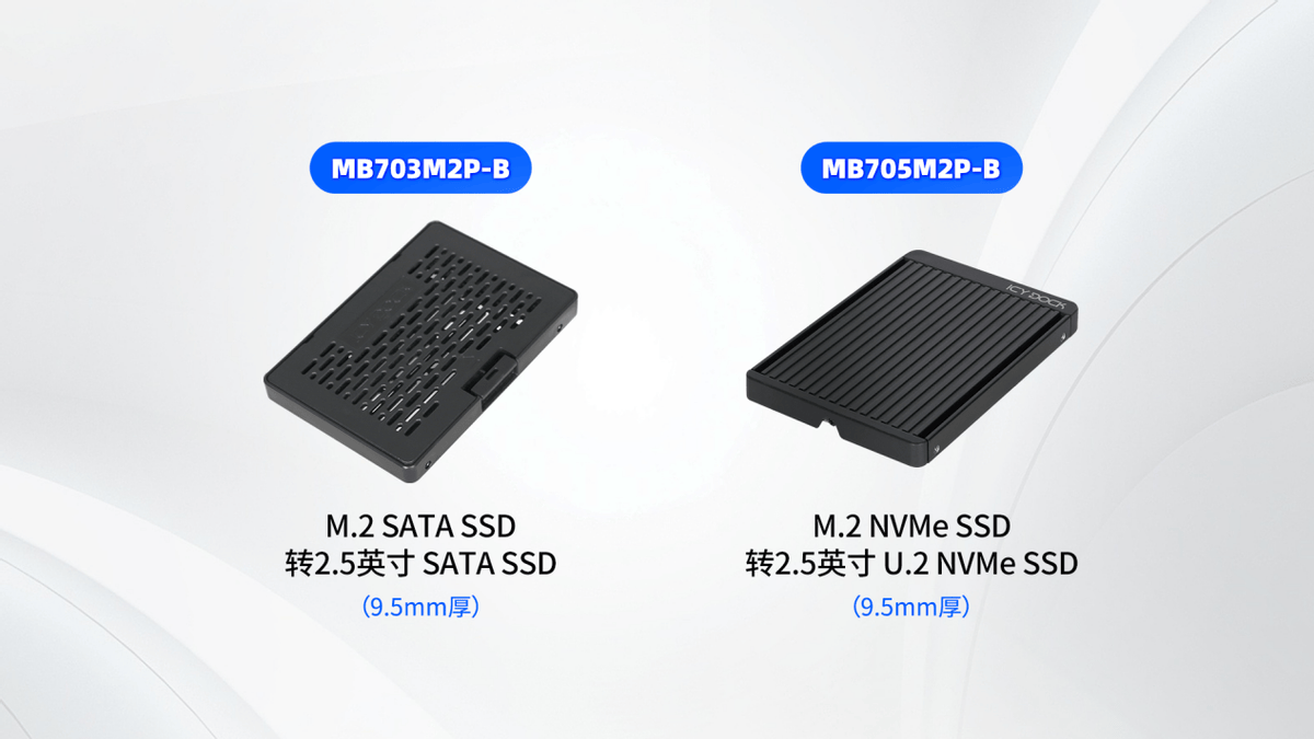 ICY DOCK致力研究各种转换抽取硬盘盒,针对有M.2硬盘转换需求的用户,分别推出了M.2 SATA SSD转SATA 硬盘的MB703M2P-B转接盒,以及M.2 NVMe SSD转U.2硬盘的MB705M2P-B转接盒。