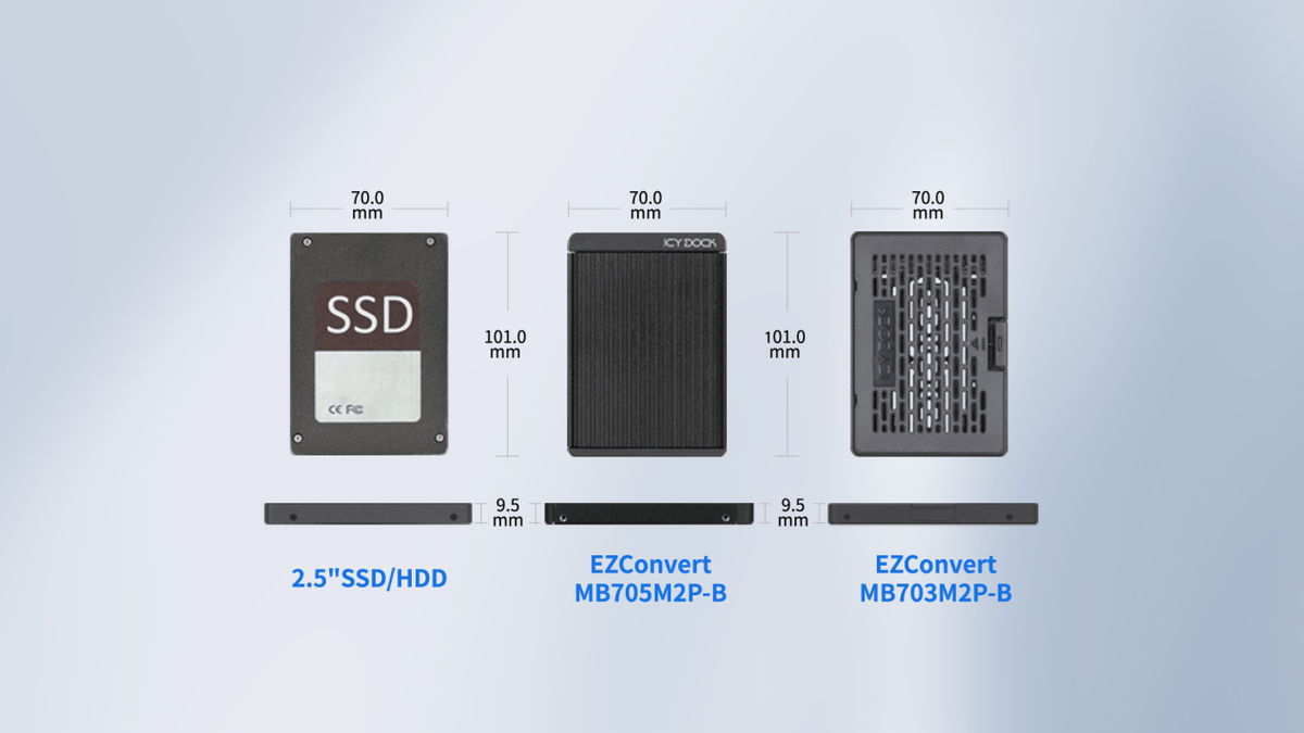 ICY DOCK的MB703M2P-B硬盘转接盒可将任何M.2 SATA SSD转换为标准的2.5英寸SATA SSD(高度为9.5毫米),其尺寸和端口位置与传统的2.5英寸SATA硬盘相同。
