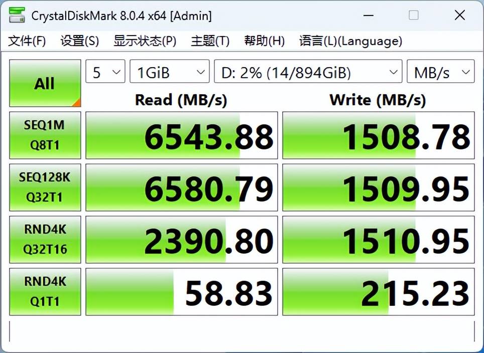 在硬盘直连的情况下,顺序读取达到6543MB/s,顺序写入达到1508MB/s;4K随机读取达到2390MB/s,4K随机写入达到1510MB/s。