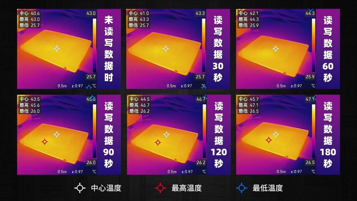在室温26.5°C且机箱无散热风扇的情况下(机箱侧板打开状态),通过手持测温热像仪检测温度,硬盘直连待机时,温度为43.0°C,随后每30秒进行一次温度监控,具体数据如上图所示,随着时间的推移,温度逐渐上升,当硬盘测试进行到180秒时,温度已经来到47.1°C,由此可见U.2硬盘的发热量还是非常高的。