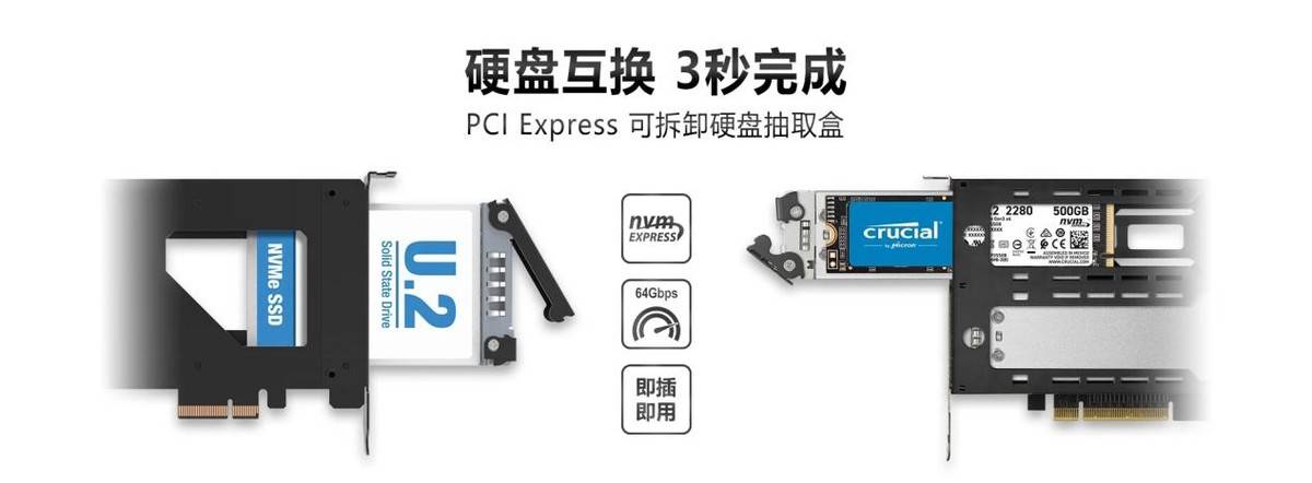 并且通过创新设计,巧妙地将一个完整的U.2/U.3 NVMe SSD存储解决方案封装于单个PCIe x4扩展插槽内,极大地简化了安装流程。用户可轻松将其安装至支持PCIe的主板上,享受高速数据传输带来的效率飞跃。更令人称道的是,该硬盘盒支持热插拔功能,允许用户在无需关闭系统或断开电源的情况下,不需要拆开机箱就能快速、安全地更换或升级SSD,彻底告别繁琐的数据线和电源线管理,让数据存储与管理的世界变得井然有序。