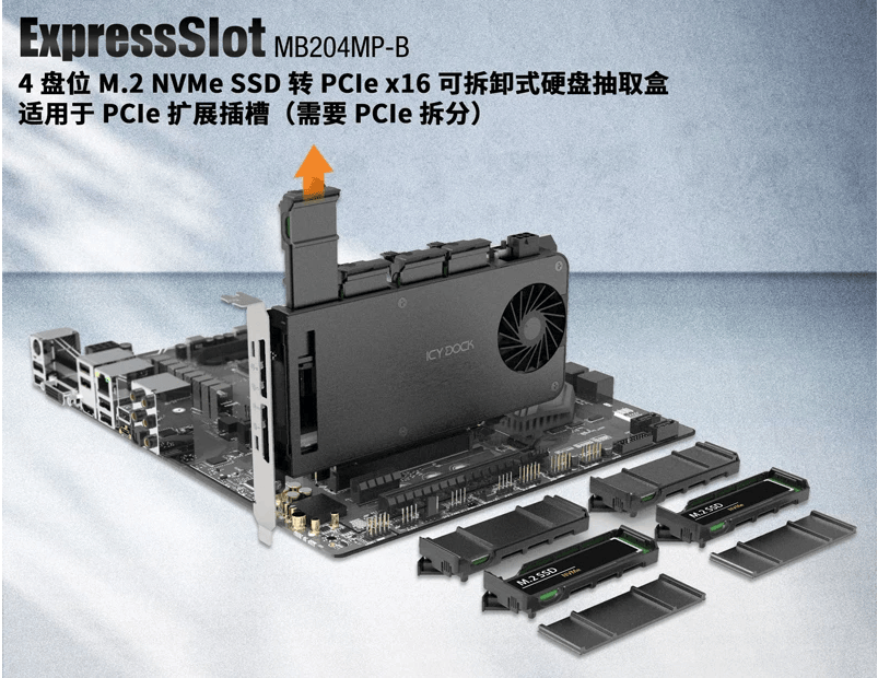 想拥有更快更大的办法?MB204MP-B一定不要错过,作为ICY DOCY近期的鼎力之作,这款专为PCIe 5.0/4.0 x16扩展插槽打造的可拆卸式4 盘位 M.2 NVMe PCIe 5.0/4.0 x4 SSD硬盘抽取盒。这款创新产品不仅实现了单个PCIe插槽下每硬盘高达128Gbps的惊人数据传输速率,更通过PCIe分叉技术(x4、x4、x4、x4配置于16x插槽),让用户能够以前所未有的便捷性,通过单一PCIe x16插槽,即时增加或移除四个独立的M.2 NVMe SSD。